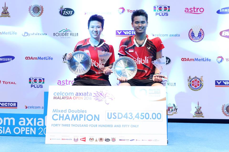 Tontowi Ahmad/Liliyana Natsir sukses merebut gelar perdananya di tahun 2016. Mereka mengalahkan pasangan tuan rumah, Chan Peng Soon/Goh Liu Ying, di final Malaysia Open Super Series Premier 2016. Kemenangan ini sekaligus menjadi gelar super series pertama, setelah gelar terakhirnya di France Open Super Series 2014 lalu.