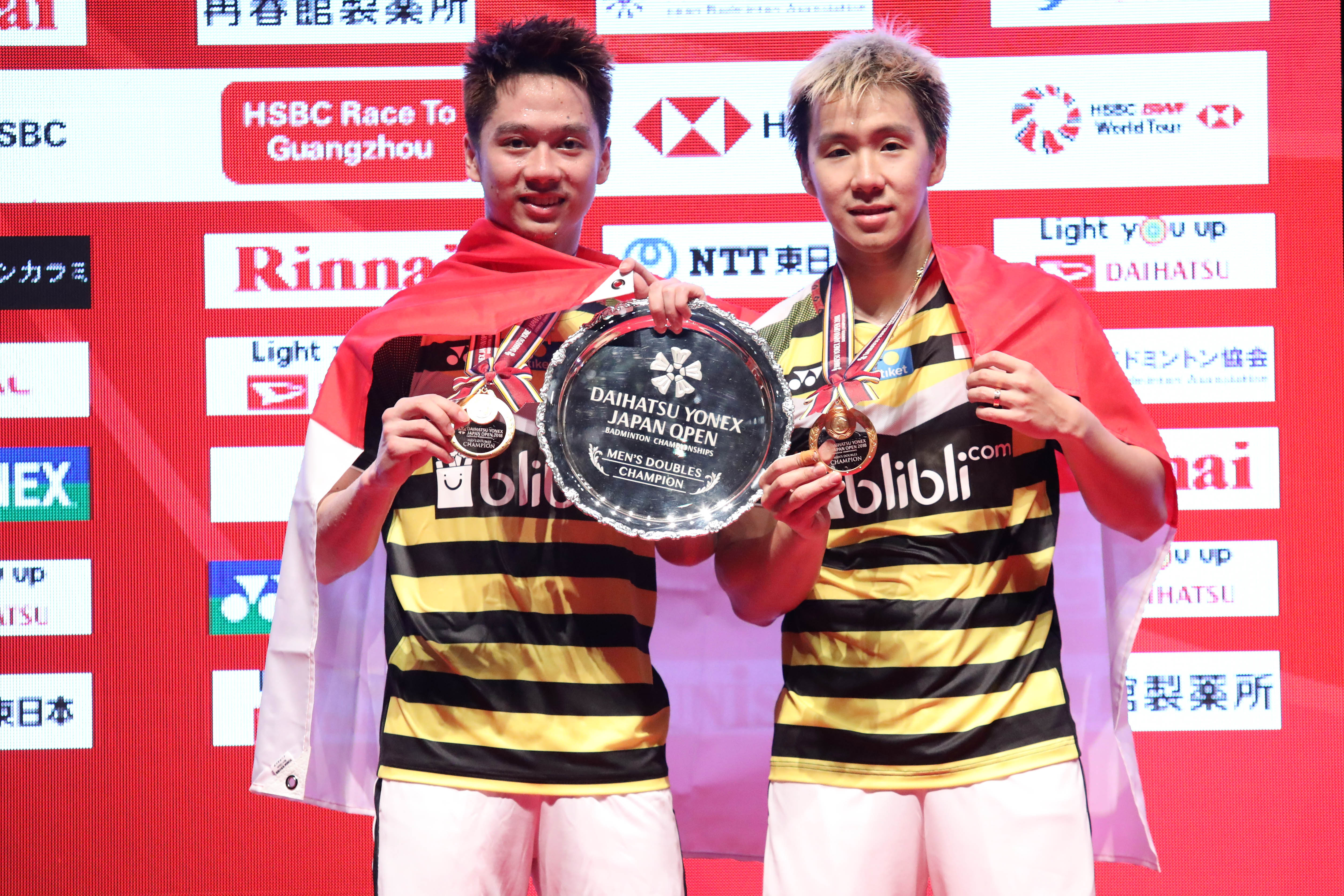 Pasangan ganda putra Kevin Sanjaya Sukamuljo/Marcus Fernaldi Gideon sukses mempertahankan gelar juara yang mereka raih di ajang Japan Open tahun lalu. Kali ini di Japan Open 2018 BWF World Tour Super 750, Kevin/Marcus kembali naik podium juara setelah mengalahkan Li Junhui/Liu Yuchen (Tiongkok), dengan skor 21-11, 21-13.