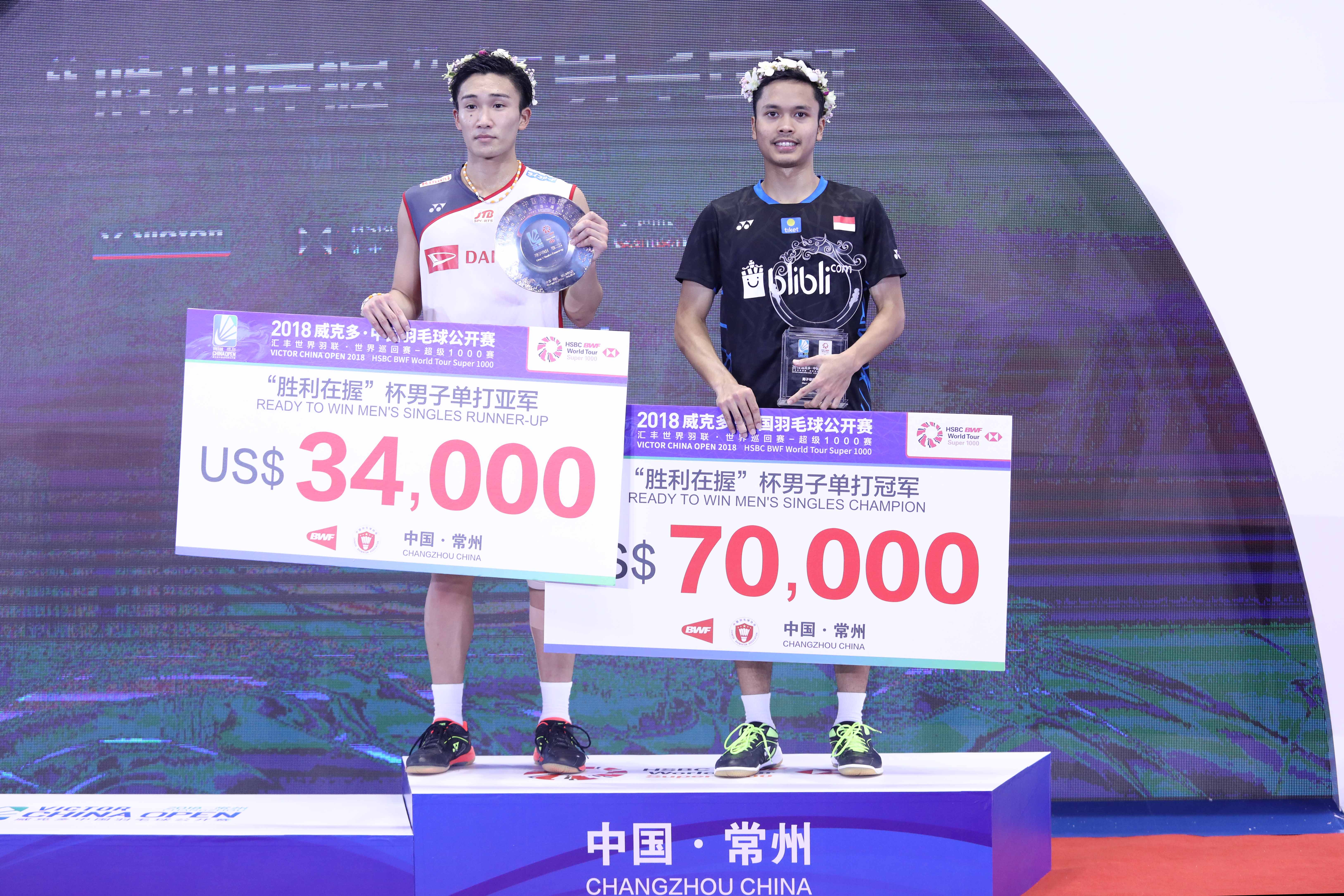 Anthony Sinisuka Ginting membuat kejutan dengan merebut gelar juara di ajang China Open 2018 setelah di final mengalahkan Kento Momota (Jepang), dengan skor 23-21, 21-19. Anthony merupakan pemain yang tak diunggulkan, namun dalam perjalanan ke podium juara, ia mampu menyingkirkan sederet pemain top dunia, hingga Momota yang merupakan Juara Dunia 2018.
