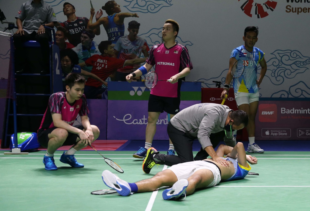 Berlaga pada babak perempatfinal di Istora Gelora Bung Karno, Senayan, Jakarta, Jumat (17/6) malam, pasangan berjuluk The Prayer itu takluk dengan skor 21-14, 12-21, 20-22 dari wakil Malaysia, Aaron Chia/Soh Wooi Yik.